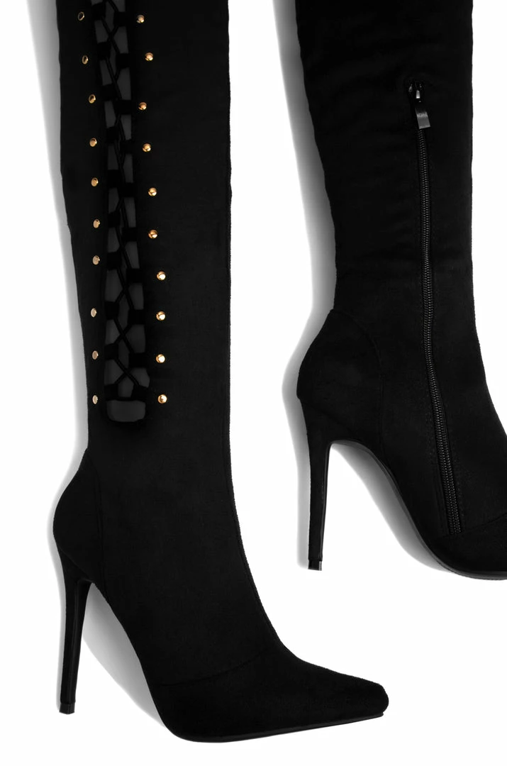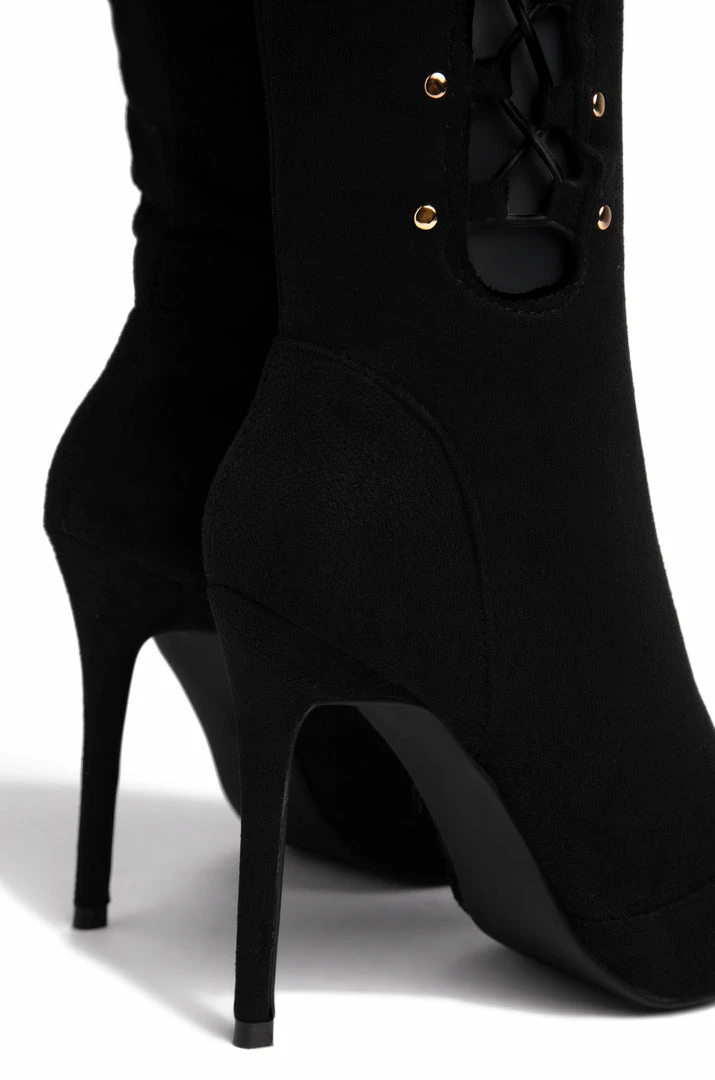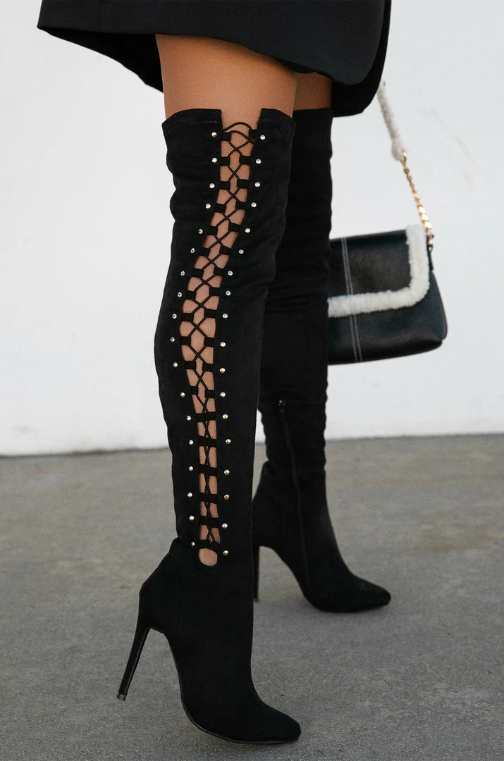 - Side Cutout Lace Up Detailing (makes for adjustable boot entry circumference)