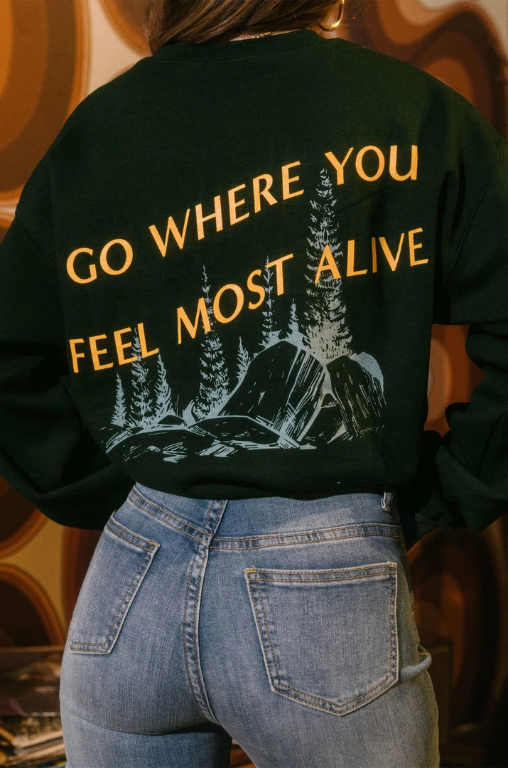 - Back GO WHERE YOU FEEL MOST ALIVE Screen Print on Center Back