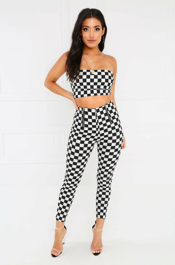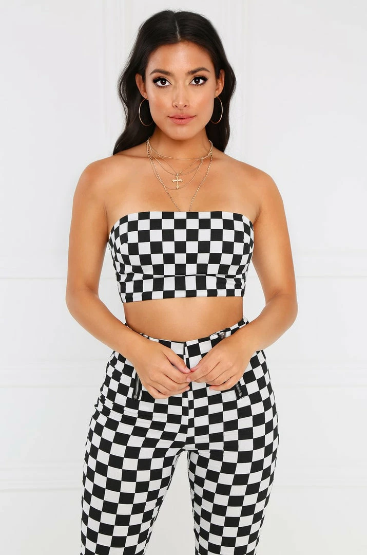 The game hasnt even started and youve already won. This sultry bandeau top features a flirty checked print and an easy back zipper closure. Pair with the matching high-rise pants and a bad-ass pair of boots, or your sexiest strappy heel, to complete the look.