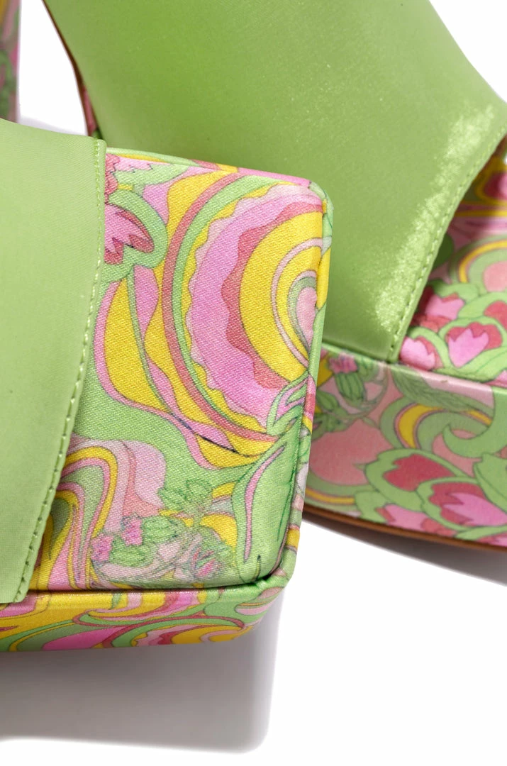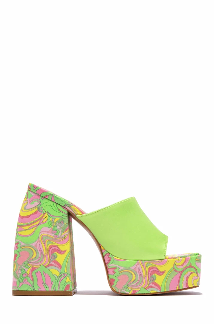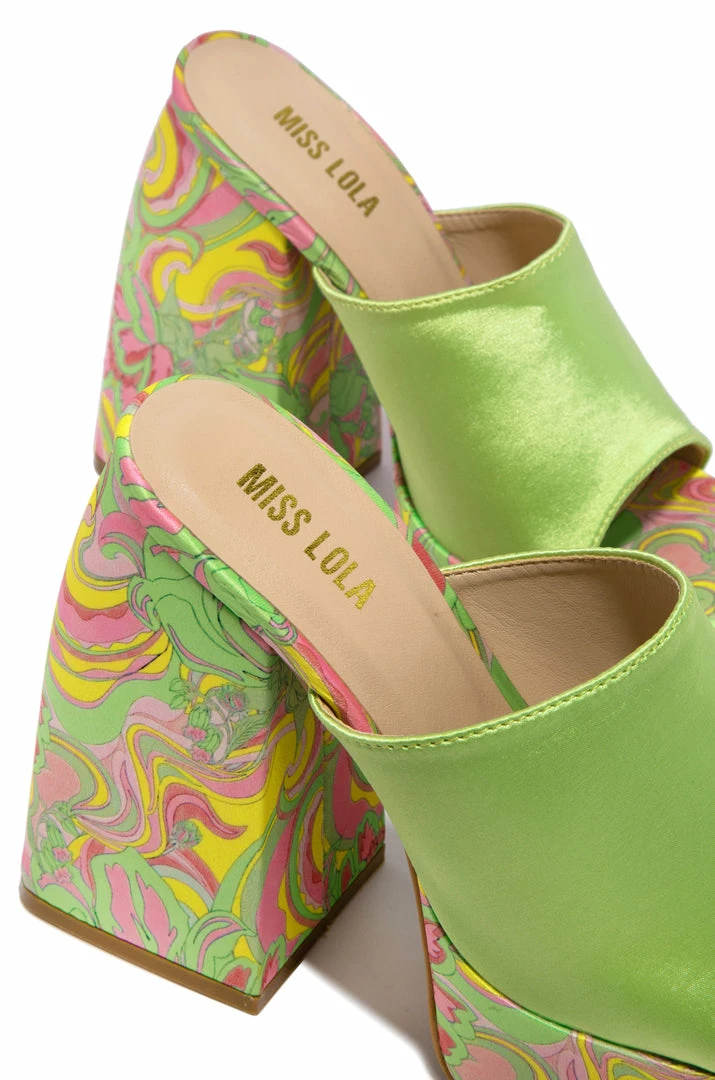 - Green Platform Block Heel Mules – print placement varies